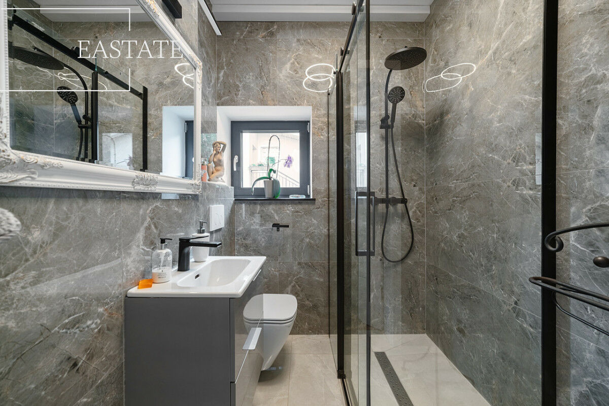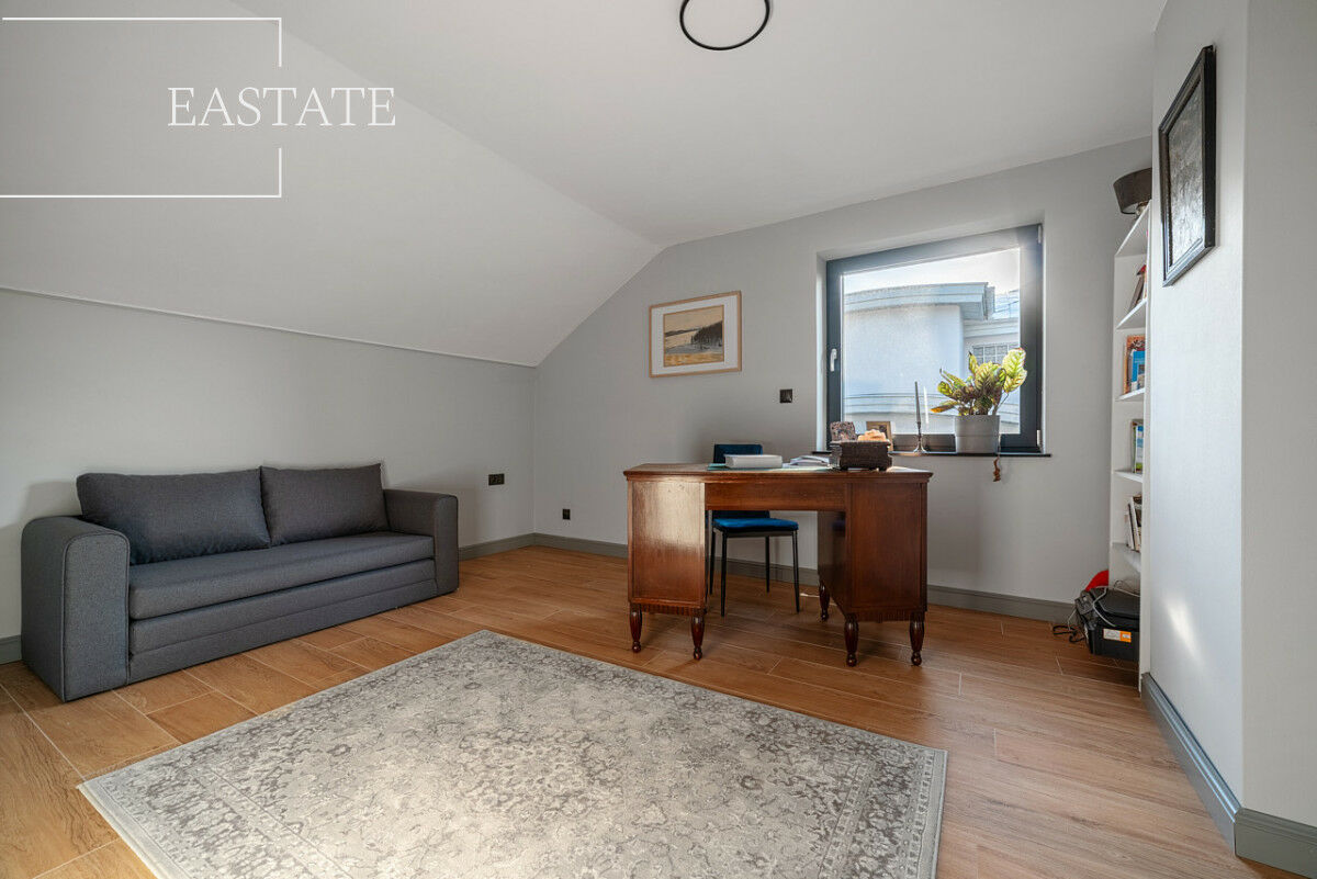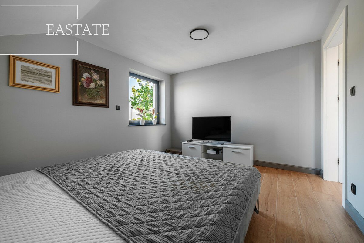 Wysoki standard wykończenia: Dom został zaprojektowany i zbudowany przez właścicieli z myślą o sobie, co widoczne jest w wyjątkowej jakości zastosowanych materiałów. Wśród nich warto wymienić ceramiczną dachówkę, granitowe parapety oraz schody wejściowe również wykonane z granitu. Dodatkowo, każdy z okien wyposażony jest w rolety sterowane zdalnie poprzez aplikację mobilną, podobnie jak wysuwana markiza na tarasie. Komfort użytkowania podnosi także ogrzewanie podłogowe, którym można zarządzać z poziomu aplikacji, a bezpieczeństwo zapewnia system monitoringu obejmujący całą posesję.